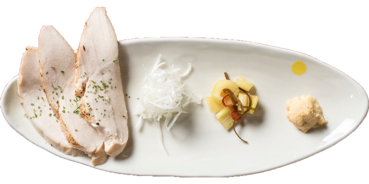 (博多華味鳥のムネ肉を低音でじっくり火入れしたヘルシーなチャーシューです。)